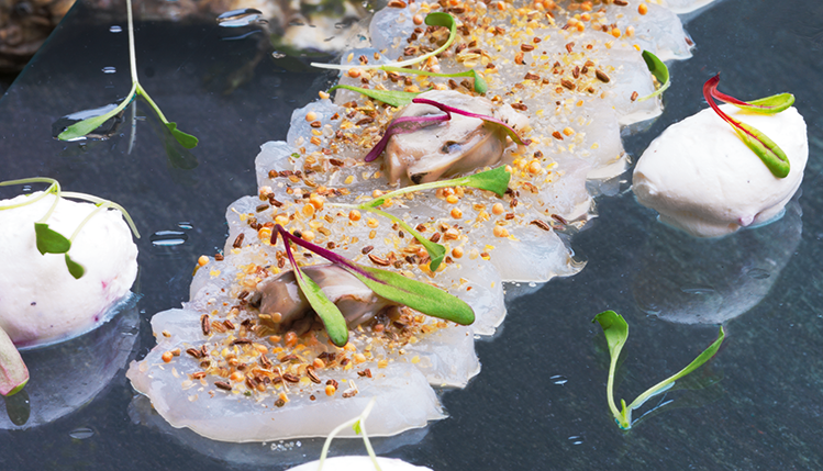 Kryddgravad hälleflundra, syltad rödlökscrème och krasse