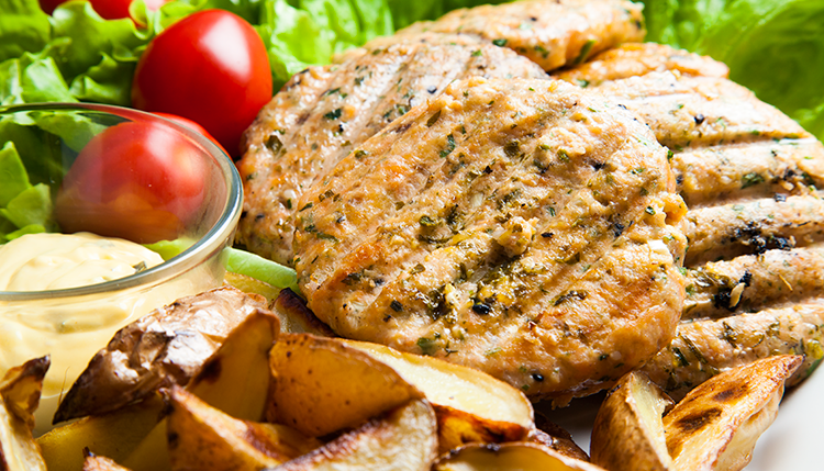 Servera laxbitarna på en bädd av druvsallad med färskpotatis.