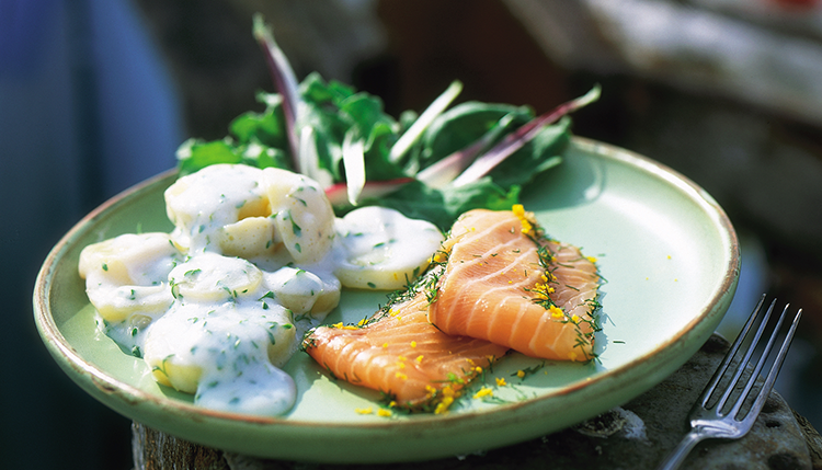 Potatisbeklädd lax med dragon och svamp