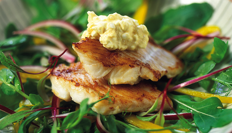 Halstrad gös med nystekt svamp, potatiskaka och färskost